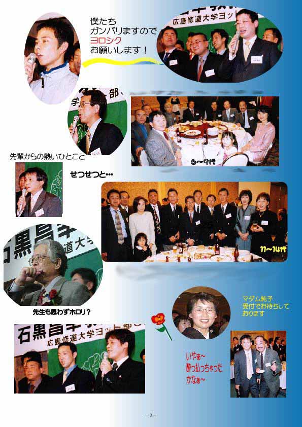 | 4/20頁 アルバムtopへ 謝恩会当日2002.1.13 ●カメラマンの タオカ君 大活躍!! ●私は デジカメで 皆さんのアップの 表情を とらえる ●印刷屋さんのマスモト先輩に 折り込みチラシの印刷は どれくらい の料金で出来るか 聞いてみた 折り込み広告の 光沢紙を使った 印刷だったら 綺麗だ それで印刷したらどうだろう。。と ずーっと 考えていたが 予算が 足りない。。 カラーコピーもそれだけの数なら 印刷の代金と大差ない。。。。 そんな 会話で 即 カラーコピー から 折り込みチラシ風 印刷に変更 条件は イラストレーターで編集すること よっしゃ! うちには 宝の持ち腐れ的 イラストレーターと 師匠のあたりめ女史が付いている ここで 大幅なる 軌道修正 目指せ!! テカテカの折り込み広告風 ● 帰宅後 あたりめ女史に さっそく 相談したのは言うまでもない 全面バックアップしていただけそうな お返事。。。。 うーん 心強い こちとら イラストレーターの背景や 文字色フォント変更すら わからない イラスト素人 |