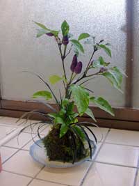 私の持ち込み紫の唐辛子と? これまた持ち込みの苺と箱根菊の釣り玉