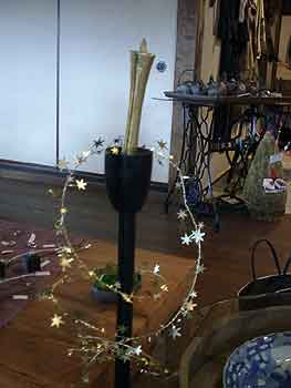 古いミシン台を 陶器の展示台として 使っているアイデアは なかなか いけてる。