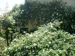 玄関まわり こんもりと白いつる薔薇が おおっています