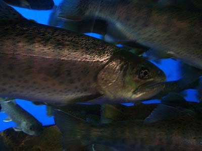 鮎の塩焼きや ヤマメの唐揚げなどが 500円から。。。 この魚は 水槽で泳ぐ。。。。。イワナ?('_'?) ほや? 水槽の中を おいしそうに泳ぐイワナ (⌒‐⌒) にんやり 会館内の 食堂の囲炉裏端 陽射しは とにかく厚い! カメラと三脚をもって。。。 全景を、