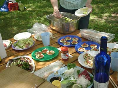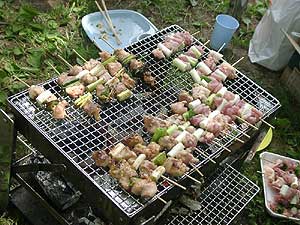 メニューは 焼き鳥・カツオのたたき・カナッペ・差し入れの お刺身・スイカ・コーヒー ・サラダ